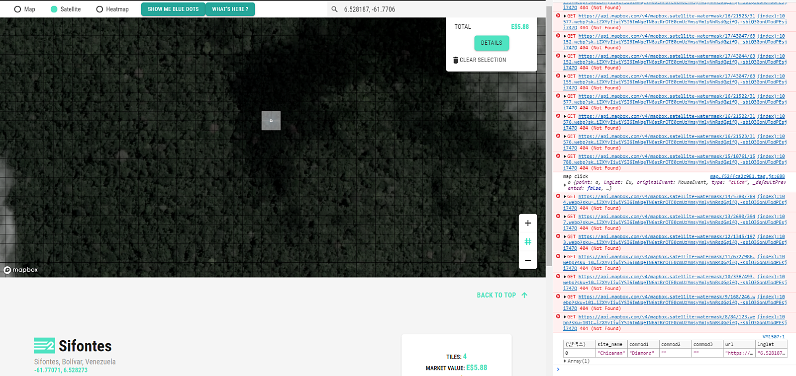 제가 1편에서 블루닷 인근에서 자원이 나온다는 것은 알았지만, 어디까지 나올 지에 관해서는 불확실하다고 말한 적이 있습니다. 왜냐하면 처음에는 화면에서 점과 떨어진 타일을 선택한 후에 What's here를 눌러서 자원을 탐색했을 때 결과가 똑같이 나왔습니다. 따라서 인근 어느 정도 범위까지 자원이 나올 것이라고 생각했지만, 정작 바로 옆 칸을 선택해도 결과 값이 나오지 않았다는 제보를 받았습니다. 따라서 What's here가 자원을 나타내는 기준은 땅을 선택하는 것이 아닐 수도 있겠다는 의심이 들었습니다. 이것이 확신으로 변한 것은 코드를 적용시킨 후 zoom out이 되었을 때 우연히 버튼을 누른 후 나타났습니다.